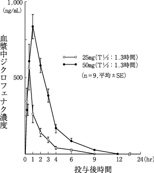 健康成人9例にボルタレンサポ25mg及び50mgを朝食1時間後に単回直腸投与した場合の平均血漿中濃度は図のように推移した5)。