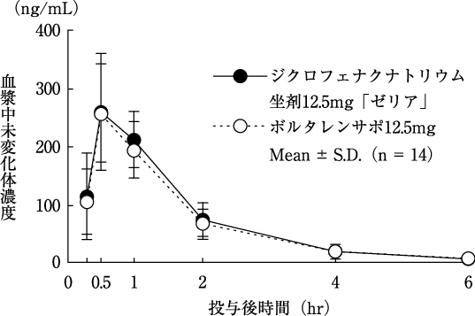 本剤とボルタレンサポ12.5mgを健康成人男子14例にそれぞれ1個(ジクロフェナクナトリウムとして12.5mg)絶食下直腸内に単回投与(クロスオーバー法)し、血漿中未変化体濃度を測定した。得られた薬物動態パラメータ(AUC、Cmax)について統計解析を行った結果、両剤の生物学的同等性が確認された6)。