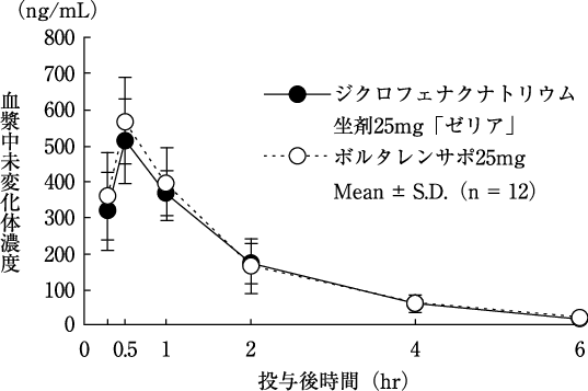 本剤とボルタレンサポ25mgを健康成人男子12例にそれぞれ1個(ジクロフェナクナトリウムとして25mg)絶食下直腸内に単回投与(クロスオーバー法)し、血漿中未変化体濃度を測定した。得られた薬物動態パラメータ(AUC、Cmax)について統計解析を行った結果、両剤の生物学的同等性が確認された7)。