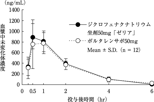 本剤とボルタレンサポ50mgを健康成人男子12例にそれぞれ1個(ジクロフェナクナトリウムとして50mg)絶食下直腸内に単回投与(クロスオーバー法)し、血漿中未変化体濃度を測定した。得られた薬物動態パラメータ(AUC、Cmax)について統計解析を行った結果、両剤の生物学的同等性が確認された8)。