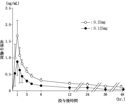 健康成人男子にハーフジゴキシンKY錠0.125又はジゴキシンKY錠0.25を1錠単回経口投与したときの血清中濃度推移 (平均値±S.D. n=8)