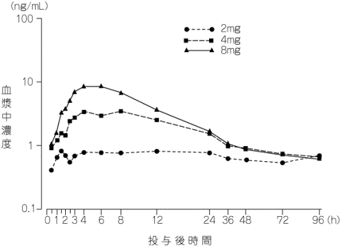 健康成人7例にペリンドプリルエルブミン4mgを14日間反復経口投与したとき、ペリンドプリラートの血漿中濃度は、投与後約1週間までに定常状態(Cmax(7日):6.9±1.7ng/mL)に達した4)。