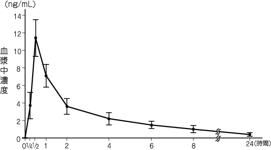 健康成人10例に本剤10mgを絶食下単回経口投与したときの血漿中濃度推移及び薬物動態パラメータは以下のとおりであった1)。