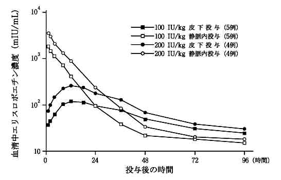 健康成人男性に100国際単位(以下IU)/kg又は200IU/kgを単回投与したとき、静脈内投与ではt1/2はそれぞれ4.76又は5.01時間であったのに対し、皮下投与では投与後12時間にCmax(それぞれ103.6又は242.3mIU/mL)に達し、t1/2はそれぞれ22.2又は22.4時間であった。投与後36時間以降は、皮下投与の方が高い濃度で推移した9) 。