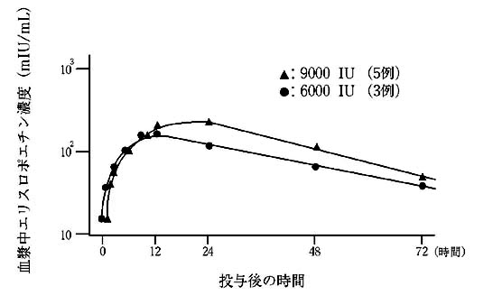 透析導入前の腎性貧血患者に6,000IU又は9,000IUを単回皮下投与したとき、投与後12~24時間にCmax(ぞれぞれ153又は219mIU/mL)に達し、t1/2はそれぞれ24.6又は19.1時間であった10) 。