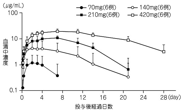 健康成人に本剤70、140、210及び420mg注3)を単回皮下投与したときの血清中濃度推移及び薬物動態パラメータは以下のとおりであった。Cmax及びAUC0-tは投与量比以上に増加し、本剤の薬物動態は非線形性を示した1)。