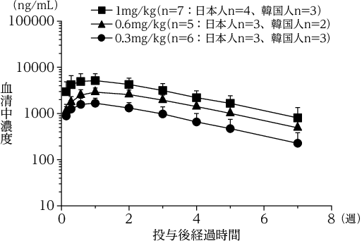 日本人及び韓国人の成人X染色体連鎖性低リン血症性くる病・骨軟化症患者を対象として本剤0.3、0.6及び1mg/kgを単回皮下投与したときの血清中濃度推移及び薬物動態パラメータは以下のとおりであった。Cmax及びAUC0-∞は投与量に比例して増加した1)。