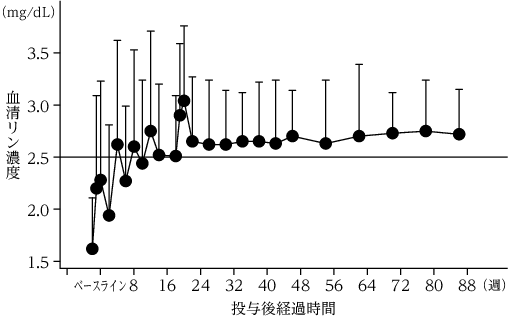 腫瘍性骨軟化症患者13例(日本人9例)を対象とした非盲検試験において、本剤(開始用量は0.3mg/kg、4週以降は必要に応じて0.2mg/kgの幅(ただし、0.3mg/kgから初めて増量する場合に限り次回の用量を0.6mg/kg)で0.1~2mg/kgの範囲で調整)を4週に1回、88週間投与したときの血清リン濃度の推移は以下のとおりであった。