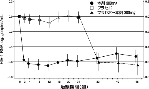 抗レトロウイルス薬による治療を経験した患者550例を対象とし,継続中の抗レトロウイルス薬による治療に本剤(300mg 1日1回投与)又はプラセボを併用した多施設二重盲検試験を実施した4)。患者の試験開始時の平均CD4リンパ球数は427cells/mm3,血漿中HIV-1 RNA量の中央値は2,340copies/mLであり,HIV-1感染症に対する前治療歴は平均5.4年であった。また,患者の平均年齢は42歳,85%が男性であり,69%が白人であった。試験開始後48週までの血漿中HIV-1 RNA量の経時的変化(log10copies/mL)を図1に示す。なお,本試験では試験開始後24週目よりプラセボ投与群は,全て本剤投与へと変更された。