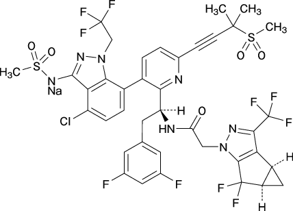 Monosodium[4-chloro-7-{2-[(1S)-1-{2-[(3bS,4aR)-5,5-difluoro-3-(trifluoromethyl)-3b,4,4a,5-tetrahydro-1H-cyclopropa[3,4]cyclopenta[1,2-c]pyrazol-1-yl]acetamido}-2-(3,5-difluorophenyl)ethyl]-6-[3-(methanesulfonyl)-3-methylbut-1-yn-1-yl]pyridin-3-yl}-1-(2,2,2-trifluoroethyl)-1H-indazol-3-yl](methanesulfonyl)azanide