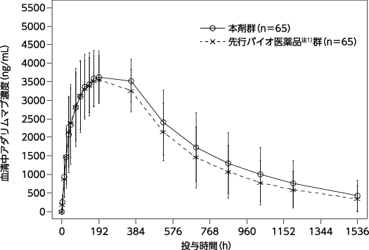 アダリムマブ(遺伝子組換え)[アダリムマブ後続1]は、ヒト腫瘍壊死因子α(TNF-α)に対する遺伝子組換えヒトIgG1モノクローナル抗体である。アダリムマブ(遺伝子組換え)[アダリムマブ後続1]は、チャイニーズハムスター卵巣細胞により産生される。アダリムマブ(遺伝子組換え)[アダリムマブ後続1]は、451個のアミノ酸残基からなるH鎖(γ1鎖)2本及び214個のアミノ酸残基からなるL鎖(κ鎖)2本で構成される糖タンパク質である。
