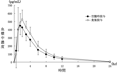 健康成人男性12例にイミダフェナシン0.1mgを空腹時に単回経口投与した時、血漿中濃度は投与後1.5時間で最高に達し、その濃度は471pg/mLで、消失半減期は2.9時間であった。また、食後投与では空腹時投与に比しCmaxは1.3倍、AUC0→12は1.2倍であった3)。