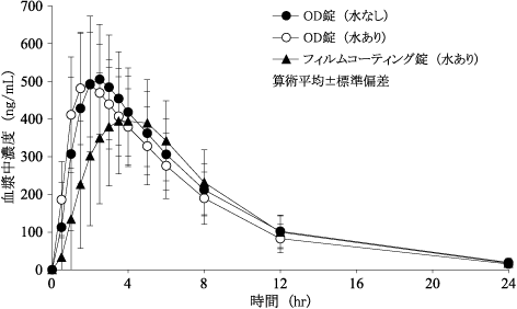 クロスオーバー法により健康成人男性(120例)に空腹時、モンテルカストOD錠10mg(1錠、水なし若しくは水あり)又はモンテルカストフィルムコーティング錠10mg(1錠、水あり)でそれぞれ単回経口投与したとき、モンテルカストの薬物動態パラメータ及び血漿中濃度推移は以下のとおりであった。得られた薬物動態パラメータ(Cmax及びAUC0-t)の幾何平均比について、90%信頼区間法にて統計解析を行った結果、Log(0.80)~Log(1.25)の範囲内であり、モンテルカストOD錠10mgは水なし又は水とともに服用した場合のいずれにおいても、モンテルカストフィルムコーティング錠10mg(水あり)と生物学的に同等であることが示された5)。