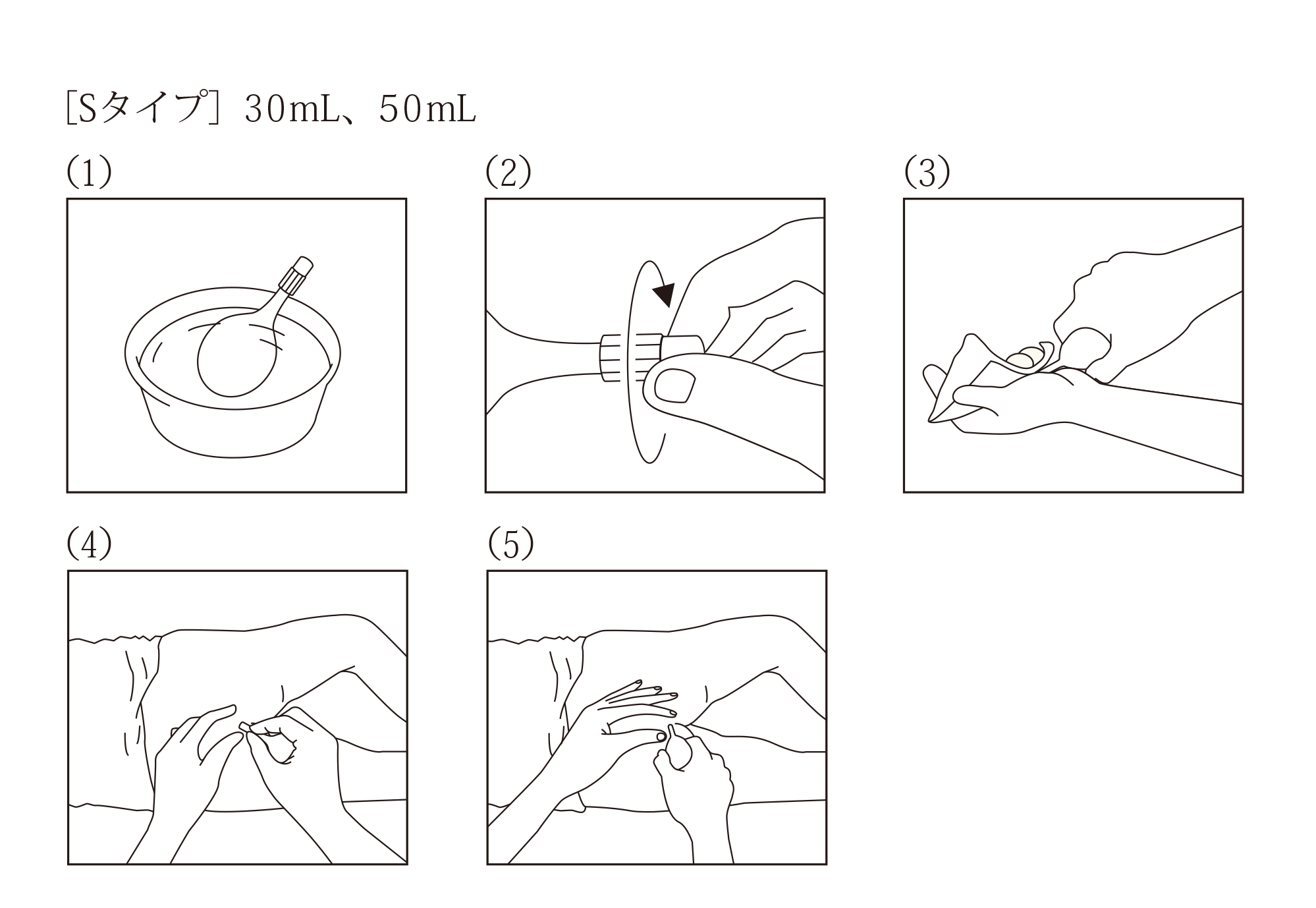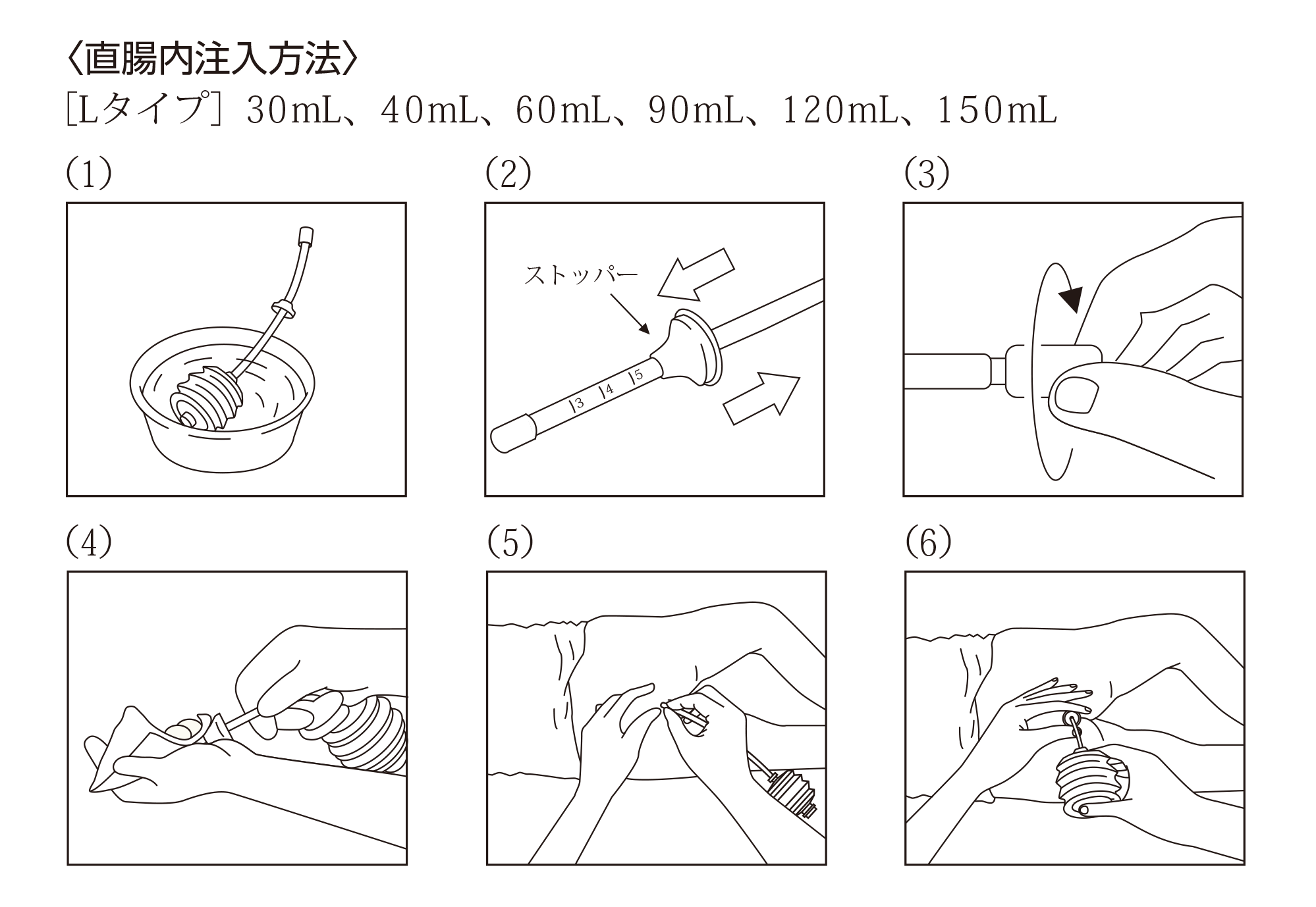(1)本品をそのまま温湯に入れ、約40℃(体温程度)に温める。(2)容器の首部を持ち、キャップをまわすように取りはずす。(3)容器の挿入部を少量の内容液で潤すか、オリブ油、ワセリン等の潤滑剤を塗布して肛門内に挿入しやすくする。(4)患者を左側臥位にして、容器内の空気を追い出した後、容器の目盛(3cm)を目安にして、挿入部を肛門内に緩徐に挿入する。30mL(3cm以上)50mL(成人の場合:5~6cm、小児の場合:3~6cm、乳児の場合:3~4cm)無理に挿入すると、直腸粘膜を損傷することがあるので注意すること。(立位の状態での浣腸は危険ですので行わないこと。)(5)浣腸液をゆっくりと直腸内に注入する。(6)浣腸液注入後、挿入部を静かに抜去し、肛門部を脱脂綿等で圧迫する。(7)通常3~10分後、便意が強まってから排便させる。