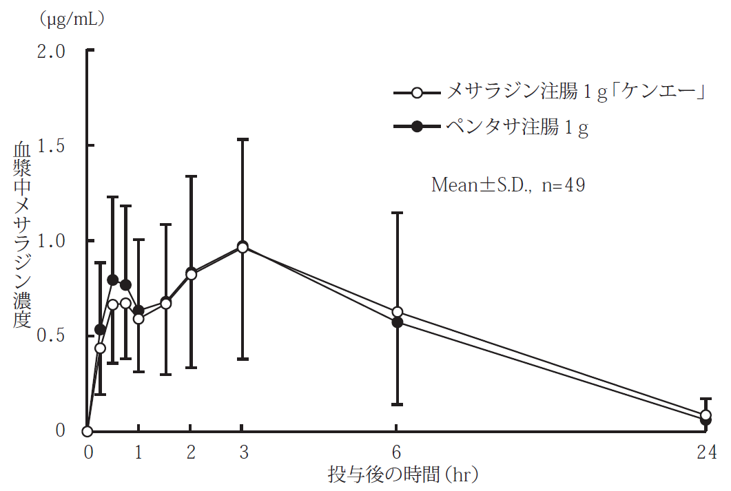 メサラジン注腸1g「ケンエー」とペンタサ注腸1gを、クロスオーバー法によりそれぞれ1個(メサラジンとして1g)健康成人男子に絶食単回直腸投与して血漿中未変化体濃度を測定し、得られた薬物動態パラメータ(AUC、Cmax)について90%信頼区間法にて統計解析を行った結果、log(0.80)~ log(1.25)の範囲内であり、両剤の生物学的同等性が確認された53) 。