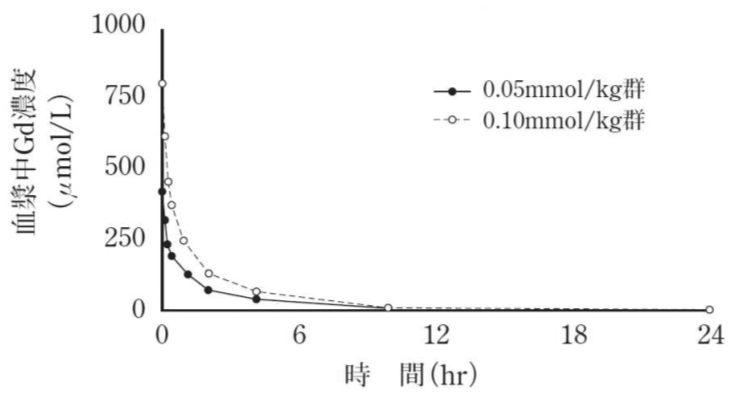 健康成人男性各5例に、本剤0.1mL/kg(0.05mmol/kg)、0.2mL/kg(0.10mmol/kg)を静脈内投与したところ、血中からの分布相半減期及び消失相半減期はそれぞれ5.0~5.9分、72.0~72.6分であった1) 。