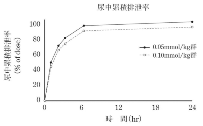健康成人男性各5例に、本剤0.1mL/kg(0.05mmol/kg)、0.2mL/kg(0.10mmol/kg)を静脈内単回投与したところ、6時間後までに投与量の89%以上が、24時間後までに95%以上が尿中に排泄された。HPLC法を用いた尿中代謝物の分析において未変化体のみが検出されたことから、本剤は静脈内投与後に代謝されず未変化体のまま尿中に排泄されることが示唆された1) 。
