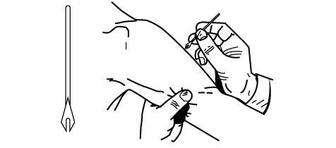 多刺法:二叉針を用いる方法で、針を皮膚に直角に保ち、針を持った手首を皮膚の上において、手首の動きで皮膚を圧刺する。圧刺回数は、通常、専用の二叉針を用いて15回を目安とし、血がにじむ程度に圧刺すること1)。他の二叉針を用いる場合は、それらの二叉針の使用上の注意にも留意して圧刺すること。