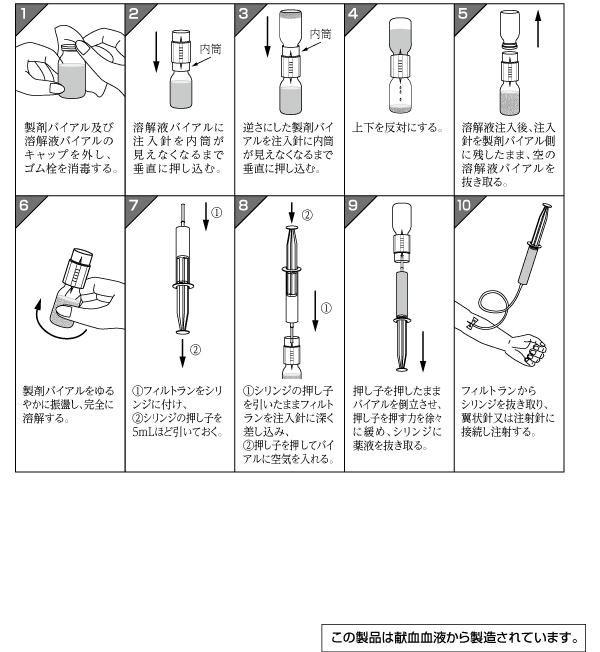 1バイアル溶剤:日本薬局方注射用水 5mL、溶解液注入針、フィルトラン、シリンジ、翼状針、アルコール綿、救急絆創膏添付
