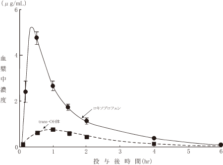 ロキソプロフェンナトリウム水和物は経口投与されたとき、胃粘膜刺激作用の弱い未変化体のまま消化管より吸収され、その後速やかにプロスタグランジン生合成抑制作用の強い活性代謝物trans-OH体(SRS配位)に変換されて作用する。シクロオキシゲナーゼを作用点としたプロスタグランジン生合成抑制作用により、すぐれた鎮痛・抗炎症・解熱作用を有し、特に鎮痛作用が強力である28),29)。