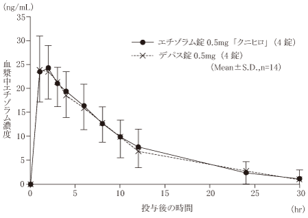 エチゾラム錠0.5mg「クニヒロ」とデパス錠0.5mgを、クロスオーバー法によりそれぞれ4錠(エチゾラムとして2mg)健康成人男子に空腹時単回経口投与して血漿中未変化体濃度を測定し、得られた薬物動態パラメータ(AUC、Cmax)について統計解析を行った結果、両剤の生物学的同等性が確認された1)。