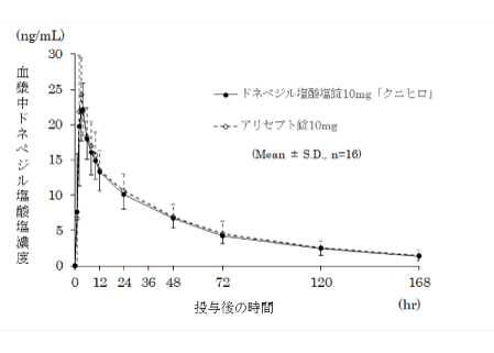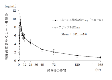 ドネペジル塩酸塩錠5mg「クニヒロ」とアリセプト錠5mg、又は、ドネペジル塩酸塩錠10mg「クニヒロ」とアリセプト錠10mgを、クロスオーバー法によりそれぞれ1錠(ドネペジル塩酸塩として5mg又は10mg)を健康成人男子に絶食下単回経口投与して血漿中未変化体濃度を測定し、得られた薬物動態パラメータ(AUC0→168hr、Cmax)について90%信頼区間法にて統計解析を行った結果、log(0.80)~log(1.25)の範囲内であり、両剤の生物学的同等性が確認された3),4)。