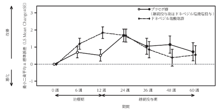 本試験では、認知機能障害、精神症状・行動障害の両症状に対するドネペジル塩酸塩の有効性がプラセボに比較して優れているという検証仮説は検証されていない20)。