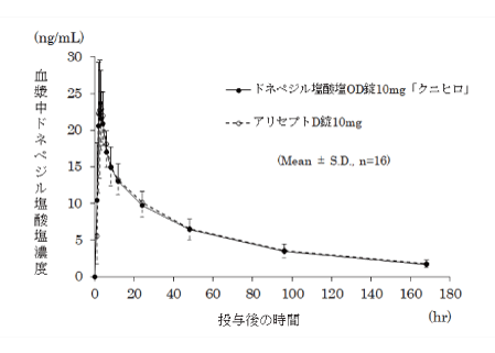 ドネペジル塩酸塩OD錠10mg「クニヒロ」とアリセプトD錠10mgを、クロスオーバー法によりそれぞれ1錠(ドネペジル塩酸塩として10mg)を健康成人男子に絶食下単回経口投与(水なしで服用(n=16)又は水で服用(n=16))して血漿中未変化体濃度を測定し、得られた薬物動態パラメータ(AUC0→168hr、Cmax)について90%信頼区間法にて統計解析を行った結果、log(0.80)~log(1.25)の範囲内であり、両剤の生物学的同等性が確認された3)。