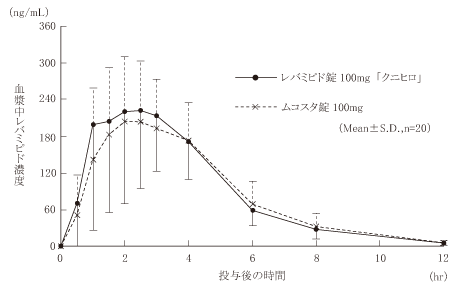 レバミピド錠100mg「クニヒロ」とムコスタ錠100mgを、クロスオーバー法によりそれぞれ1錠(レバミピドとして100mg)健康成人男子に絶食下単回経口投与して血漿中未変化体濃度を測定し、得られた薬物動態パラメータ(AUC、Cmax)について90%信頼区間法にて統計解析を行った結果、log(0.8)~log(1.25)の範囲内であり、両剤の生物学的同等性が確認された2)。