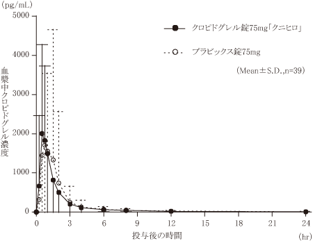 健康成人にクロピドグレル硫酸塩(クロピドグレルとして75mg)を食後に単回経口投与した場合のSR26334(主代謝物)の薬物動態パラメータは以下のとおりである10)。