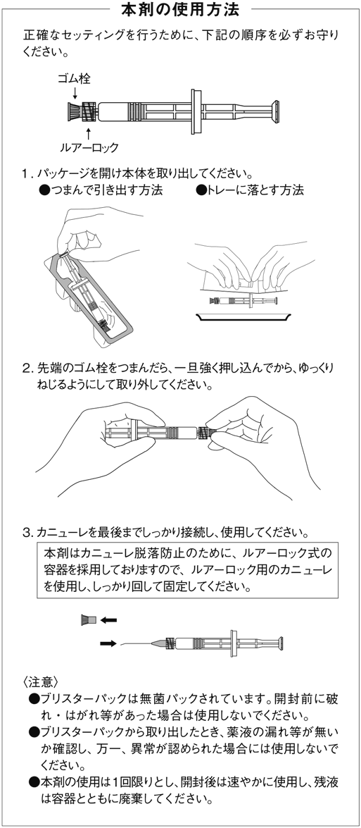 白内障手術・眼内レンズ挿入術を連続して施行する場合には、通常0.2~0.75mLを前房内へ注入する。また、眼内レンズのコーティングに約0.1mL使用する。ただし、白内障手術又は眼内レンズ挿入術のみを施行する場合には、以下のとおりとする。