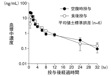 未変化体の薬物動態に対する食事の影響は、食後単回投与では空腹時単回投与に比べTmaxの遅延とCmaxの低下がみられたが、食後投与と空腹時投与でAUCに大きな差は認められなかった2)。