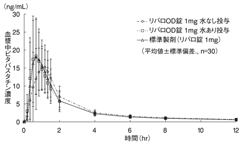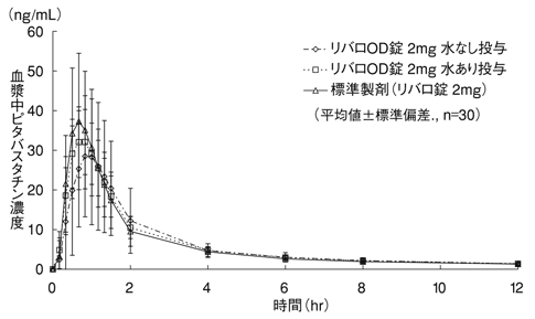 リバロOD錠1mg及びリバロ錠1mg、各1錠をクロスオーバー法により健康成人男性に絶食後経口投与したとき、リバロOD錠1mgは、水なし投与、水あり投与ともにリバロ錠1mgと生物学的に同等であることが確認された2)。同様に、リバロOD錠2mgにおいてもリバロ錠2mgとの生物学的同等性が確認された3)。