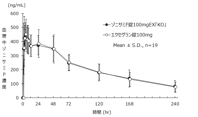 ゾニサミド錠100mgEX「KO」と エクセグラン錠100mgを、クロスオーバー法によりそれぞれ1錠(ゾニサミドとして100mg)健康成人男子に絶食単回経口投与して血漿中未変化体濃度を測定し、得られた薬物動態パラメータ(AUCt、Cmax)について90%信頼区間法にて統計解析を行った結果、log(0.80)~log(1.25)の範囲内であり、両剤の生物学的同等性が確認された2) 。