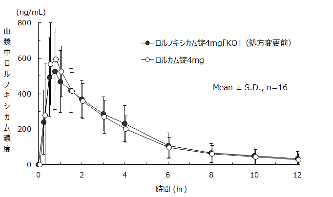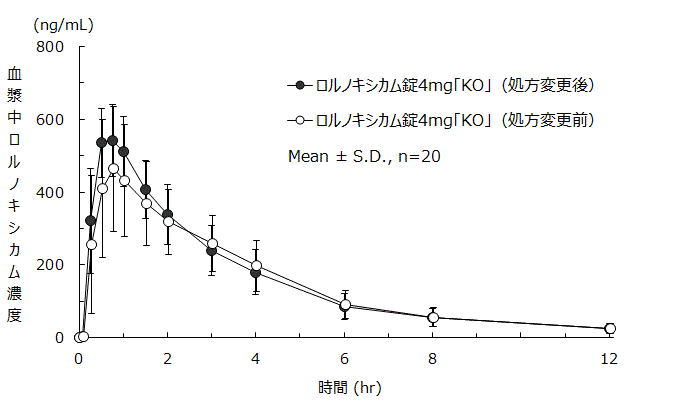 ロルノキシカム錠4mg「KO」(処方変更後)とロルノキシカム錠4mg「KO」(処方変更前)をクロスオーバー法によりそれぞれ1錠(ロルノキシカムとして4mg)健康成人男子に絶食単回経口投与して、血漿中ロルノキシカム(未変化体)濃度を測定し、得られた薬物動態パラメータ(AUCt、Cmax)について90%信頼区間法にて統計解析を行った結果、log(0.80)~log(1.25)の範囲内であり、両剤の生物学的同等性が確認された5) 。