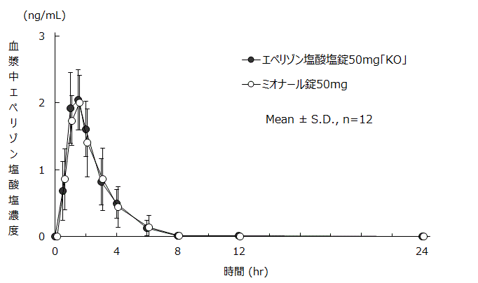 エペリゾン塩酸塩錠50mg「KO」とミオナール錠50mgを、2剤2期のクロスオーバー法によりそれぞれ1錠(エペリゾン塩酸塩として50mg)健康成人男子に絶食単回経口投与して、血漿中未変化体濃度を測定し、得られた薬物動態パラメータ(AUCt、Cmax)について90%信頼区間法にて統計解析を行った結果、log(0.80)~log(1.25)の範囲内であり、両剤の生物学的同等性が確認された2) 。
