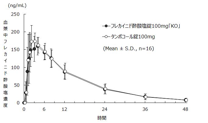 フレカイニド酢酸塩錠100mg「KO」とタンボコール錠100mgをクロスオーバー法によりそれぞれ1錠(フレカイニド酢酸塩として100mg)健康成人男子に絶食単回経口投与してLC-MS/MS法にて血漿中フレカイニド酢酸塩(未変化体)濃度を測定し、得られた薬物動態パラメータ(AUCt、Cmax)について90%信頼区間法にて統計解析を行った結果、log(0.80)~log(1.25)の範囲内であり、両剤の生物学的同等性が確認された5) 。