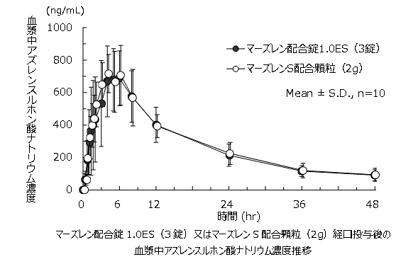マーズレン配合錠1.0ES(3錠)とマーズレンS配合顆粒(2g)(いずれもアズレンスルホン酸ナトリウム水和物として6mg)を、2剤2期のクロスオーバー法により健康成人男子に絶食時単回経口投与してHPLC法にて血漿中アズレンスルホン酸ナトリウム濃度を測定し、得られた薬物動態パラメータ(AUCt、Cmax)について90%信頼区間法にて統計解析を行った結果、log(0.80)~log(1.25)の範囲内であり、両剤の生物学的同等性が確認された1) 。