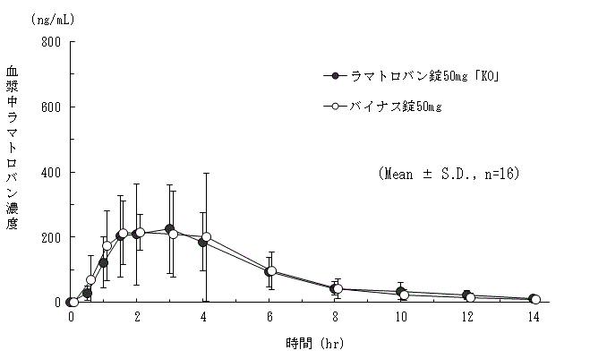 ラマトロバン錠50mg「KO」とバイナス錠50mgを、クロスオーバー法によりそれぞれ1錠(ラマトロバンとして50mg)健康成人男子に絶食及び食後単回経口投与して血漿中未変化体濃度を測定し、得られた薬物動態パラメータ(AUCt、Cmax)について90%信頼区間法にて統計解析を行った結果、log(0.80)~log(1.25)の範囲内であり、両剤の生物学的同等性が確認された6) 。