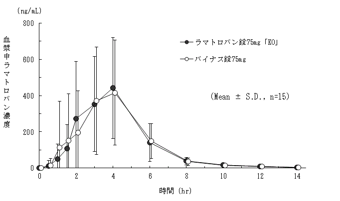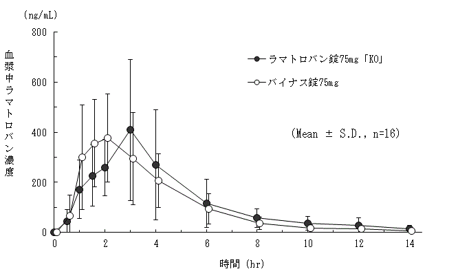 ラマトロバン錠75mg「KO」とバイナス錠75mgを、クロスオーバー法によりそれぞれ1錠(ラマトロバンとして75mg)健康成人男子に絶食及び食後単回経口投与して血漿中未変化体濃度を測定し、得られた薬物動態パラメータ(AUCt、Cmax)について90%信頼区間法にて統計解析を行った結果、log(0.80)~log(1.25)の範囲内であり、両剤の生物学的同等性が確認された7) 。