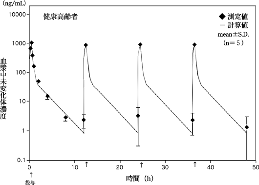 65歳以上の健康高齢者5例にエダラボンを体重1kg当たり0.5mg、30分かけて1日2回2日間反復点滴静脈内投与したときの血漿中未変化体濃度の推移及び初回投与時の血漿中未変化体濃度推移から求めたパラメータは次のとおりである。血漿中未変化体濃度は健康成人男子とほぼ同様に消失し、蓄積性は認められなかった1),2) 。