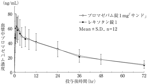ブロマゼパム錠1mg「サンド」とレキソタン錠1を、クロスオーバー法によりそれぞれ4錠(ブロマゼパム4mg)健康成人男子に絶食単回経口投与して血漿中未変化体濃度を測定し、得られた薬物動態パラメータ(AUC、Cmax)について90%信頼区間法にて統計解析を行った結果、log(0.8)~log(1.25)の範囲内であり、両剤の生物学的同等性が確認された3)。