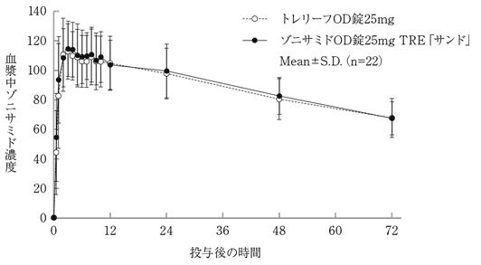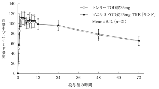 健康成人にゾニサミドOD錠25mgとゾニサミド錠25mgを、クロスオーバー法によりそれぞれ1錠(ゾニサミドとして25mg)、水あり(23例)及び水なし(23例)で1回経口投与して血漿中ゾニサミド濃度を測定し、得られた薬物動態パラメータ(AUC、Cmax)について90%信頼区間法にて統計解析を行った結果、log(0.80)~log(1.25)の範囲内であり、両剤の生物学的同等性が確認された1)。