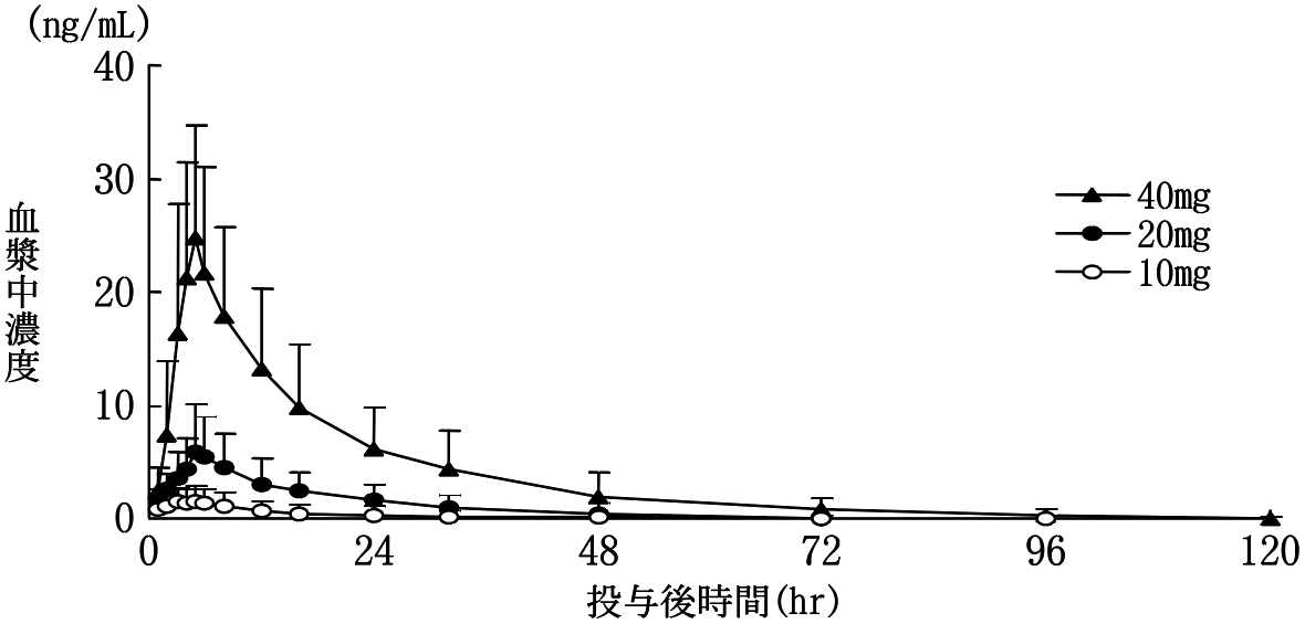 副作用発現頻度は、20mg群で75.0%(99/132例)及び40mg群で82.8%(111/134例)であった。主な副作用は、20mg群では傾眠41.7%(55/132例)、浮動性めまい18.2%(24/132例)、悪心18.9%(25/132例)及び頭痛11.4%(15/132例)、40mg群では傾眠38.8%(52/134例)、浮動性めまい30.6%(41/134例)、悪心21.6%(29/134例)、頭痛15.7%(21/134例)、便秘15.7%(21/134例)及び倦怠感10.4%(14/134例)であった36),37) 。