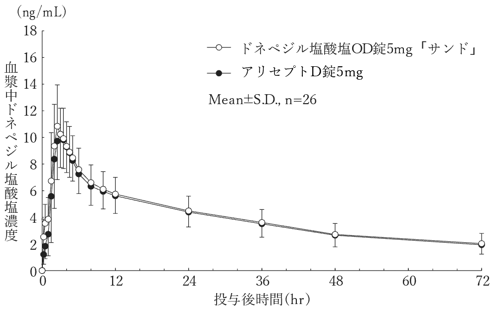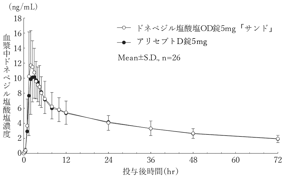 ドネペジル塩酸塩OD錠5mg「サンド」とアリセプトD錠5mgを、クロスオーバー法によりそれぞれ1錠(ドネペジル塩酸塩として5mg)健康成人男子に絶食下単回経口投与(水あり服用及び水なし服用)して血漿中未変化体濃度を測定した。得られた未変化体の薬物動態パラメータ(AUCt、Cmax)について90%信頼区間法にて統計解析を行った結果、log(0.80)~log(1.25)の範囲内であり、両剤の生物学的同等性が確認された3) 。