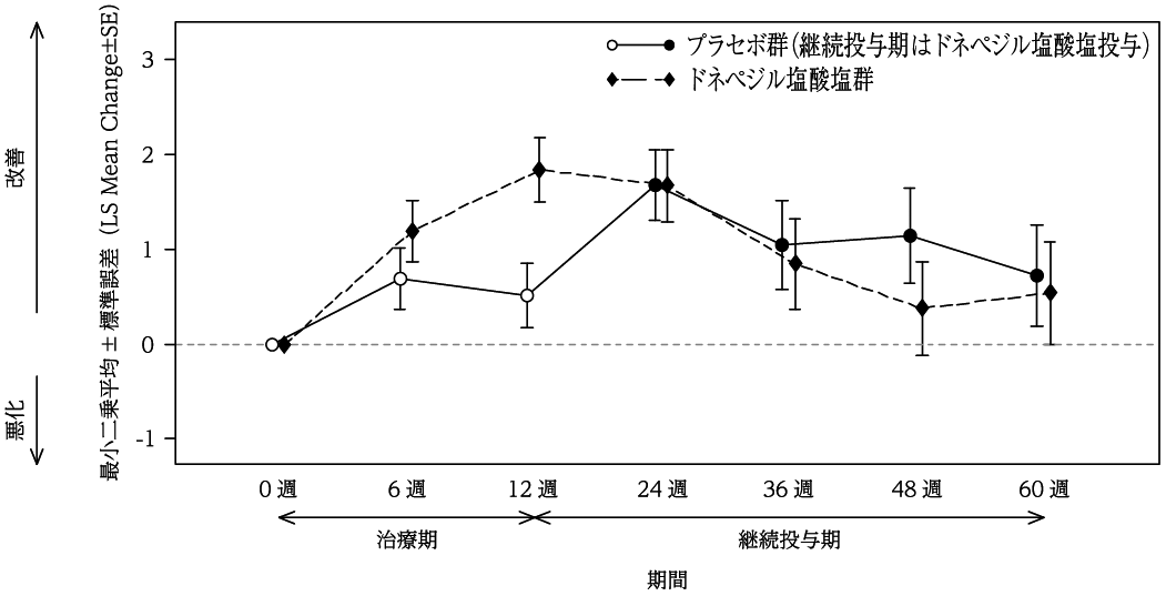 本試験では、認知機能障害、精神症状・行動障害の両症状に対するドネペジル塩酸塩の有効性がプラセボに比較して優れているという検証仮説は検証されていない20) 。