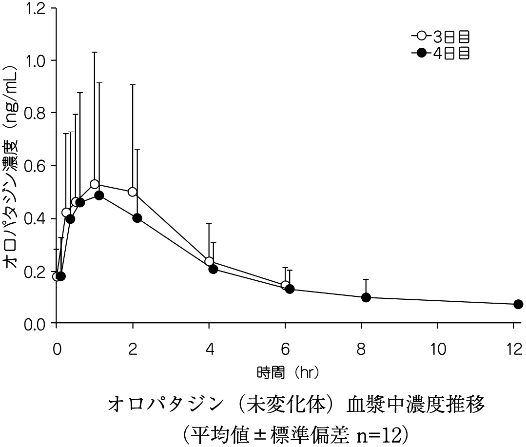 アレルギー患者(12例)に0.1%オロパタジン点眼液を、両眼に1回2滴、6時間ごとに(1日4回点眼)4日間反復点眼したときのオロパタジン(未変化体)の血漿中濃度推移及び薬物動態パラメータは下記のとおりであった(定量限界値は0.05ng/mL)3) 。