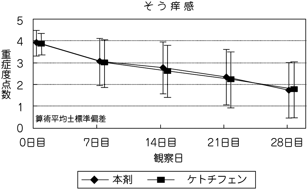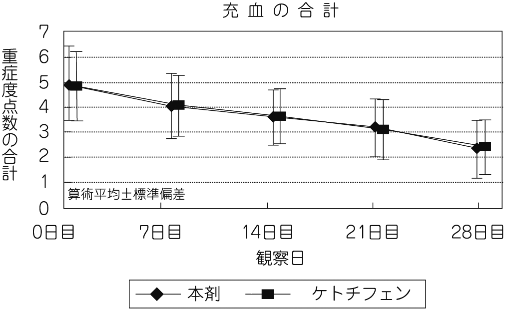 アレルギー性結膜炎患者(247例)を対象に、本剤又は0.05%ケトチフェンフマル酸塩点眼液を両眼に1回2滴、1日4回(朝、昼、夕、就寝前)28日間点眼投与したところ、そう痒感及び充血の重症度点数において、本剤は0.05%ケトチフェンフマル酸塩点眼液に劣らない有効性を示した。