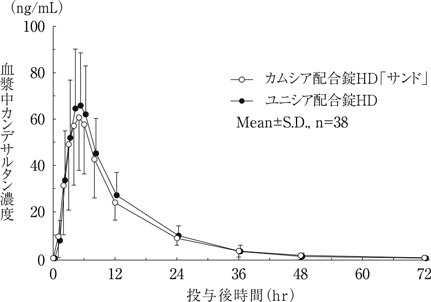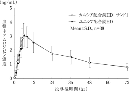 カムシア配合錠HD「サンド」とユニシア配合錠HDを、クロスオーバー法によりそれぞれ1錠(カンデサルタン シレキセチルとして8mg及びアムロジピンとして5mg)健康成人男性に絶食下単回経口投与して血漿中カンデサルタン及びアムロジピン濃度を測定した。得られたカンデサルタン及びアムロジピンの薬物動態パラメータ(AUCt、Cmax)について90%信頼区間法にて統計解析を行った結果、いずれもlog(0.80)~log(1.25)の範囲内であり、両剤の生物学的同等性が確認された9)。