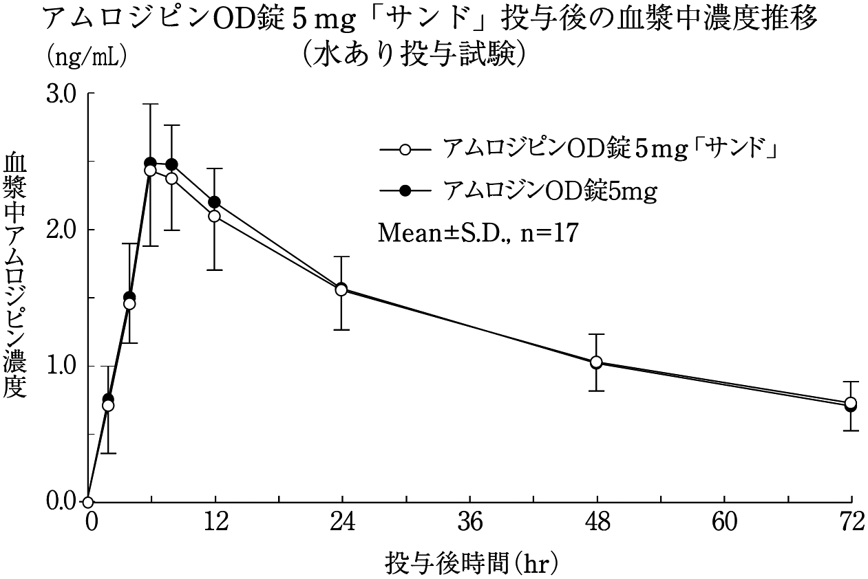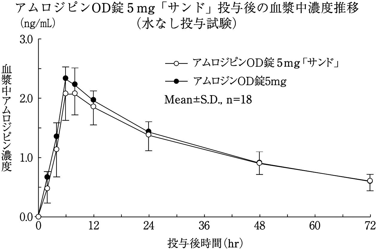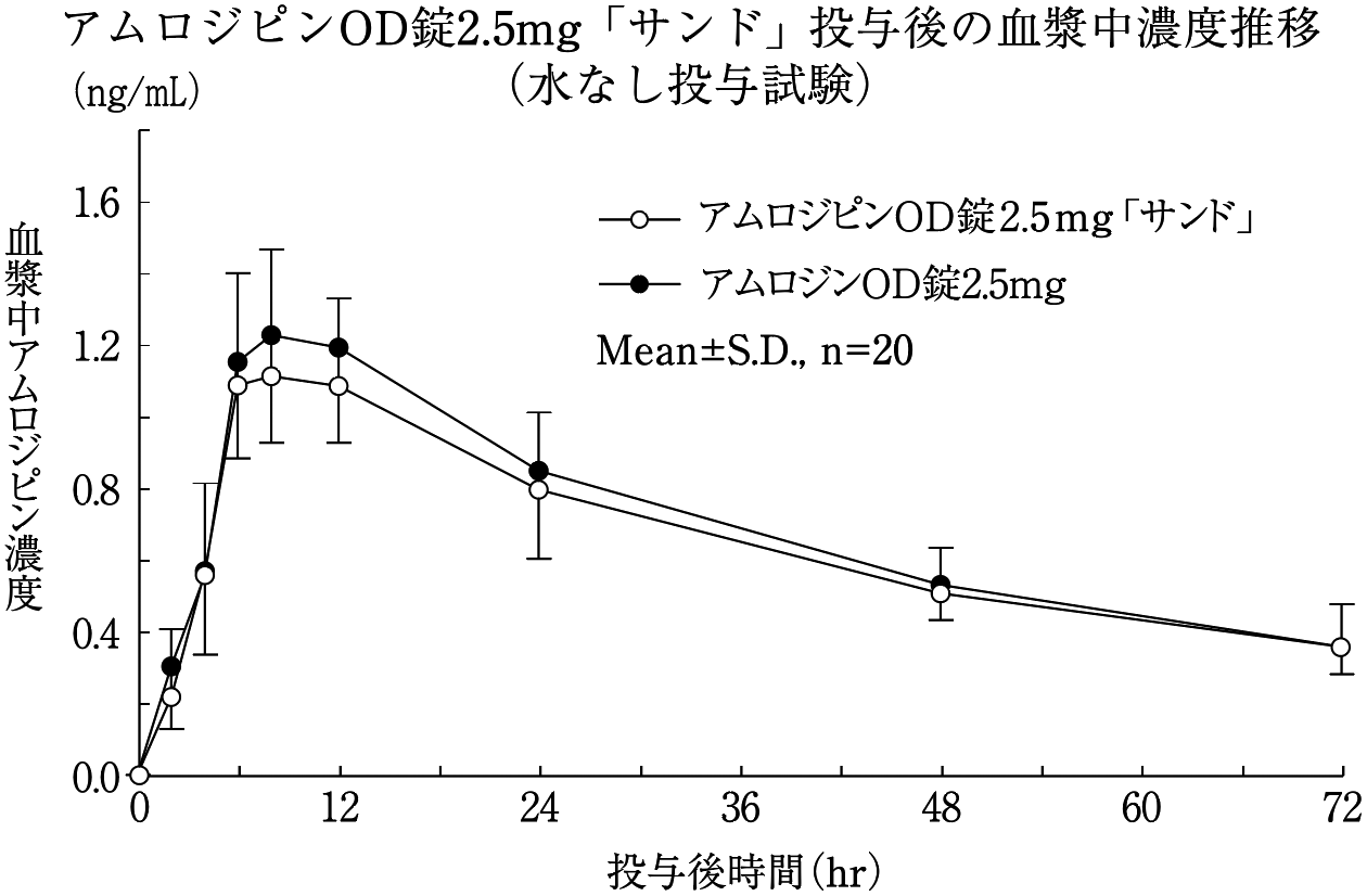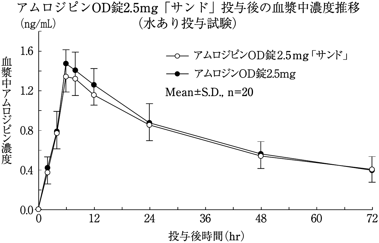 アムロジピンOD錠2.5mg「サンド」又はアムロジピンOD錠5mg「サンド」とアムロジンOD錠2.5mg又はアムロジンOD錠5mgを、クロスオーバー法によりそれぞれ1錠(アムロジピン2.5mg又は5mg)健康成人男子に絶食単回経口投与して血漿中未変化体濃度を測定し、得られた薬物動態パラメータ(AUC、Cmax)について90%信頼区間法にて統計解析を行った結果、log(0.8)~log(1.25)の範囲内であり、両剤の生物学的同等性が確認された8),9) 。